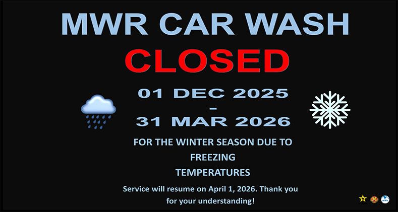 The car wash is open and available 24/7 for your convenience! Located at BLDG 107 behind the Pinn Fitness Center, close to Headquarters, this self-service facility offers two-bays equipped with a pressure wand and brush for cleaning your vehicle. We also offer two vacuum cleaners located next to the car wash. Tire pressure gauge and air are available free of charge.